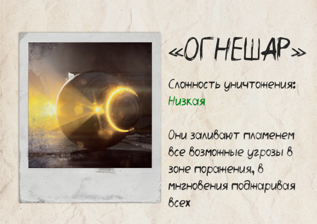 “火球”——一种球形恐怖生物,能让掠夺者惊恐逃窜。它们在室内巡逻,搜寻掠夺者,对任何声响都反应灵敏,而且显然很乐意烧烤你一番。在“火球”的外壳内部,装有一门射程相当远的火焰喷射器。