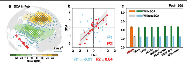 定量分析结果表明,上世纪90年代末以来,EAJ的年际变率增加了约140% (图1),这导致了整个欧亚大陆的大尺度环流、热浪、干旱以及亚洲季风和降水异常的分布格局发生重大变化。这一变化的主要触发机制起源于前期2月北大西洋的斯堪迪纳维亚模态(Scandinavian Pattern;SCA;图2)。SCA可以引起北大西洋东北部海温异常并持续到夏季,从而对EAJ活动造成显著影响。